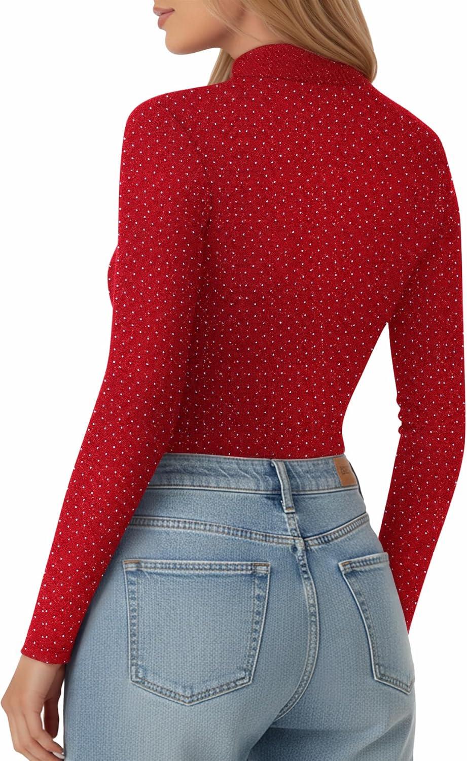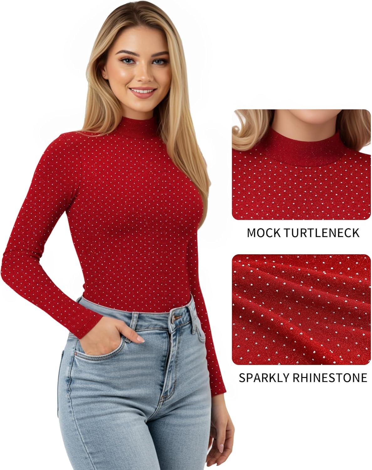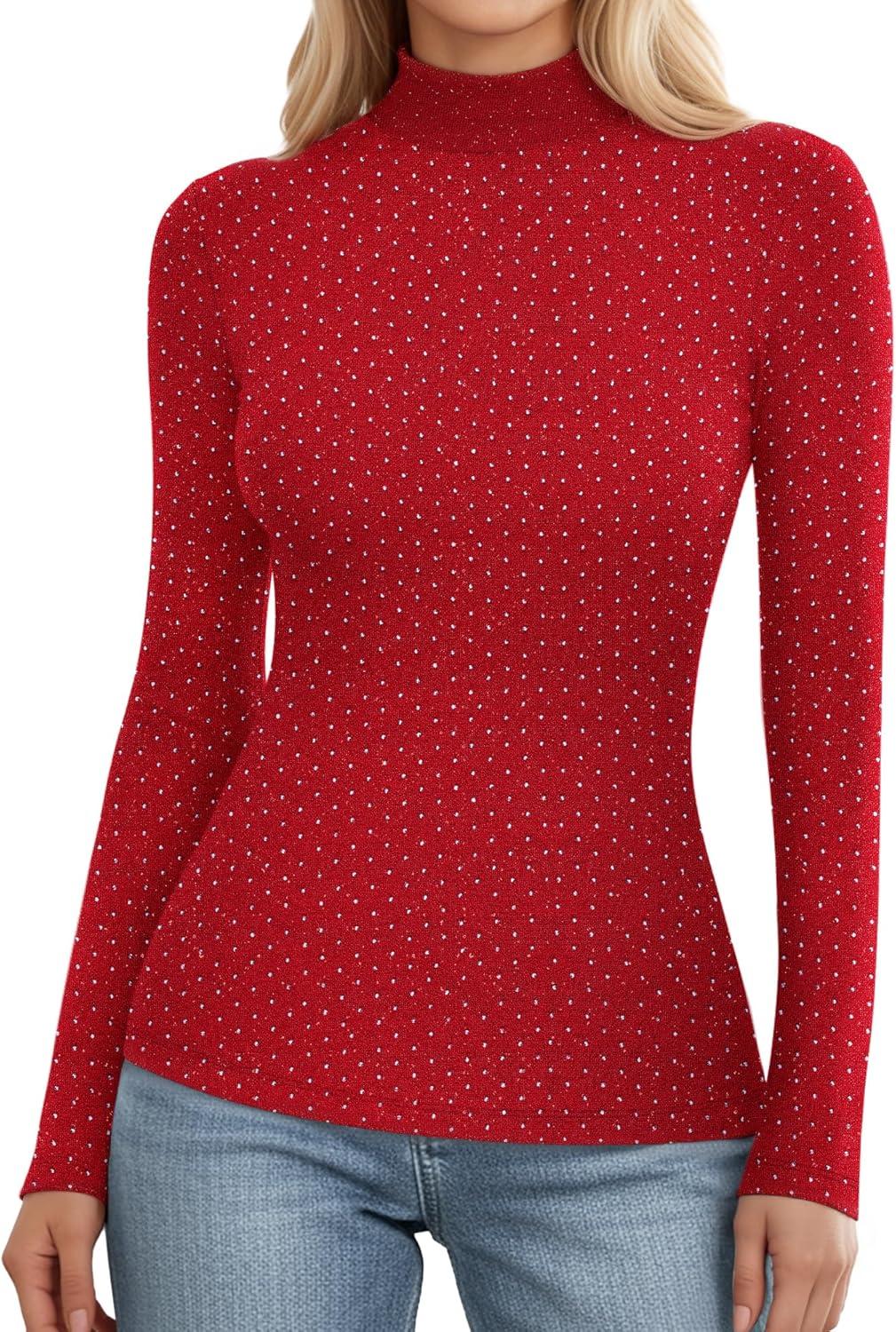 MANGOPOP Women Mock Turtle Neck Long Sleeve Shirts Sparkly Sequin Rhinestone Tops Fall Outfits Fashion Tee Winter Undershirt(Red)