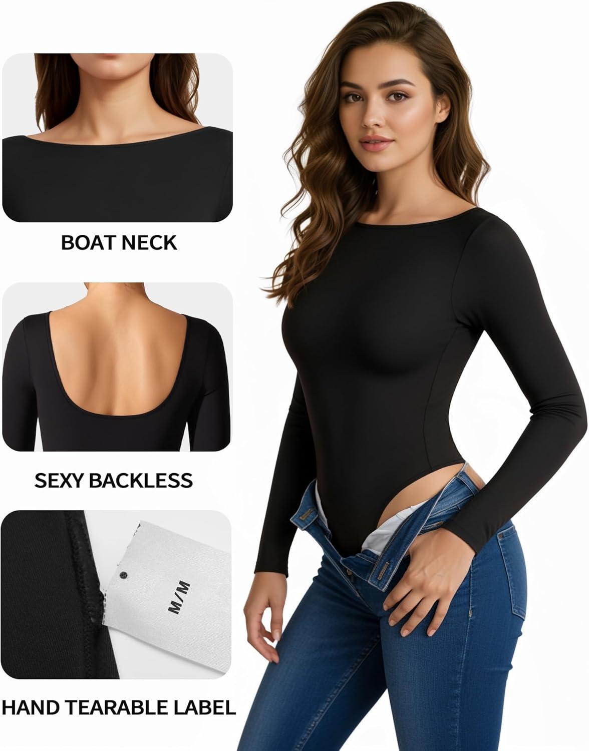 MANGOPOP Women’s Backless Long Sleeve Bodysuit Boat Neck Y2K Body Suit Open Back Sexy Fall Basic Top(01 Black)