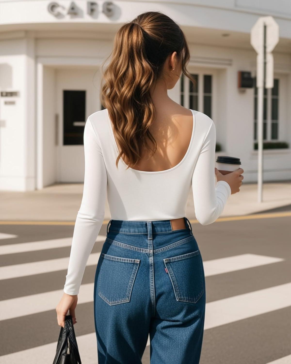 MANGOPOP Women’s Backless Long Sleeve Bodysuit Boat Neck Y2K Body Suit Open Back Sexy Fall Basic Top(02 White)