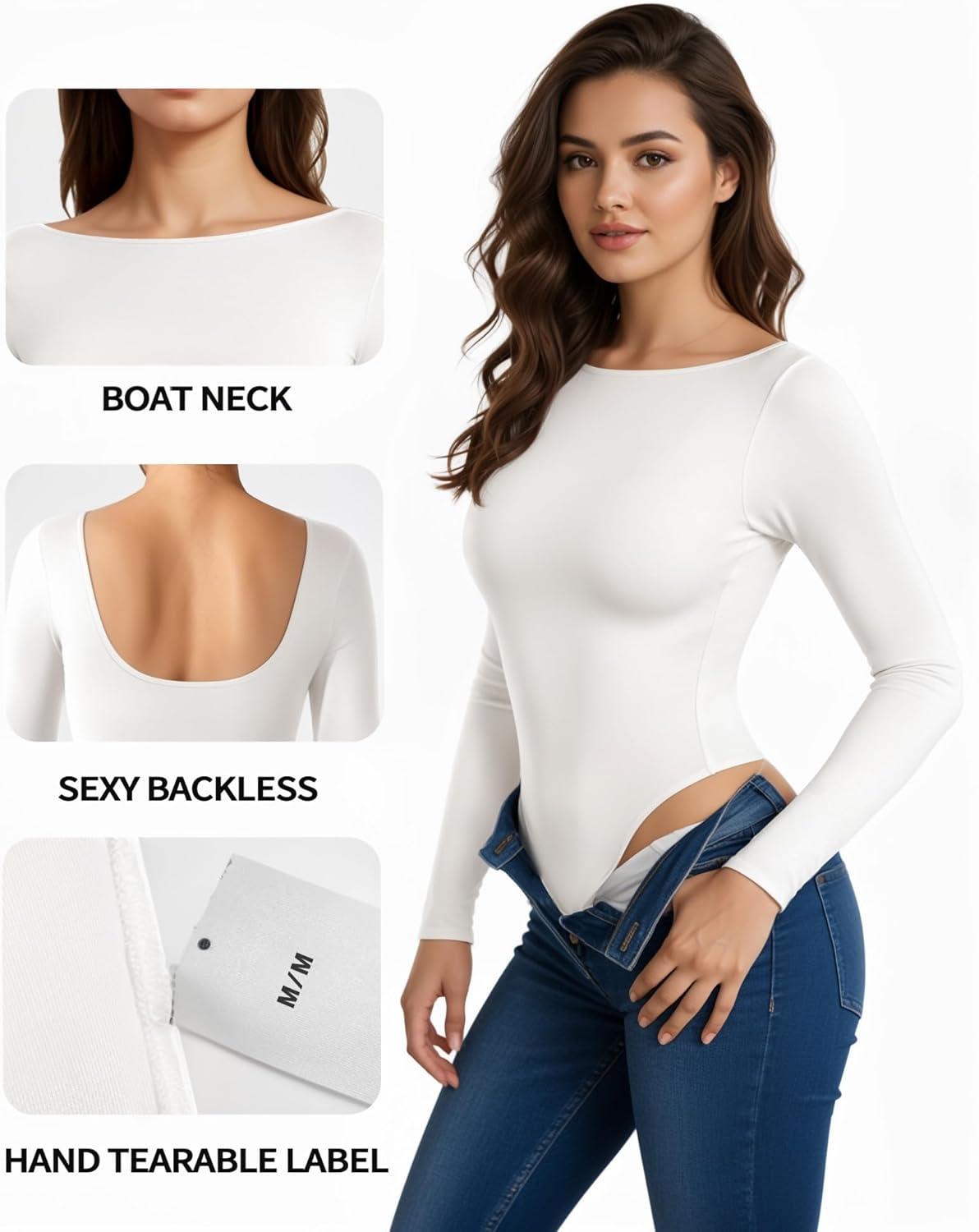 imageMANGOPOP Womens Backless Long Sleeve Bodysuit Boat Neck Y2K Body Suit Open Back Sexy Fall Basic Top02 White