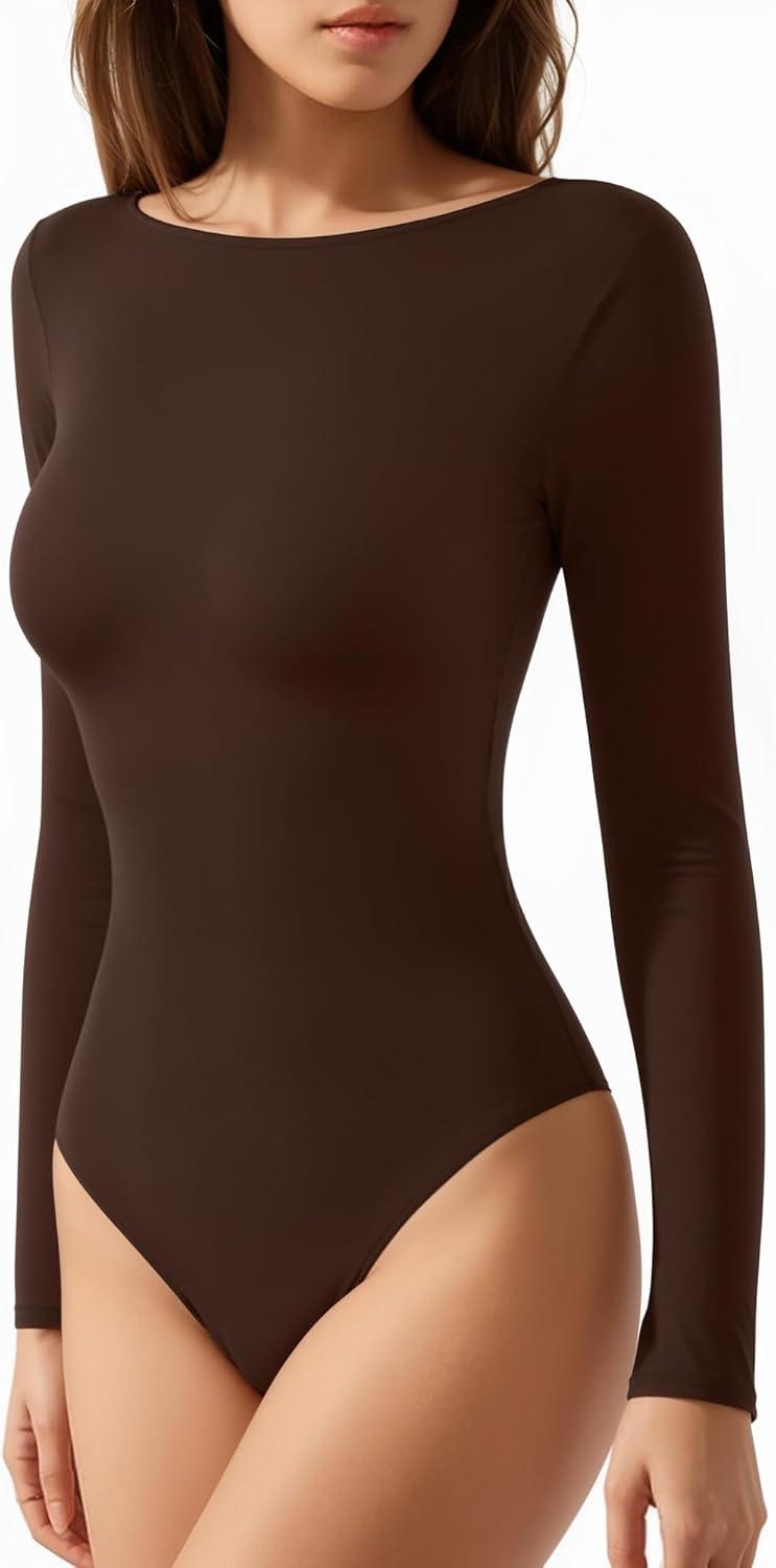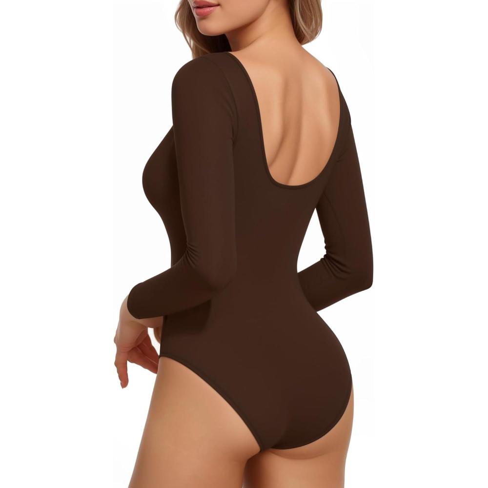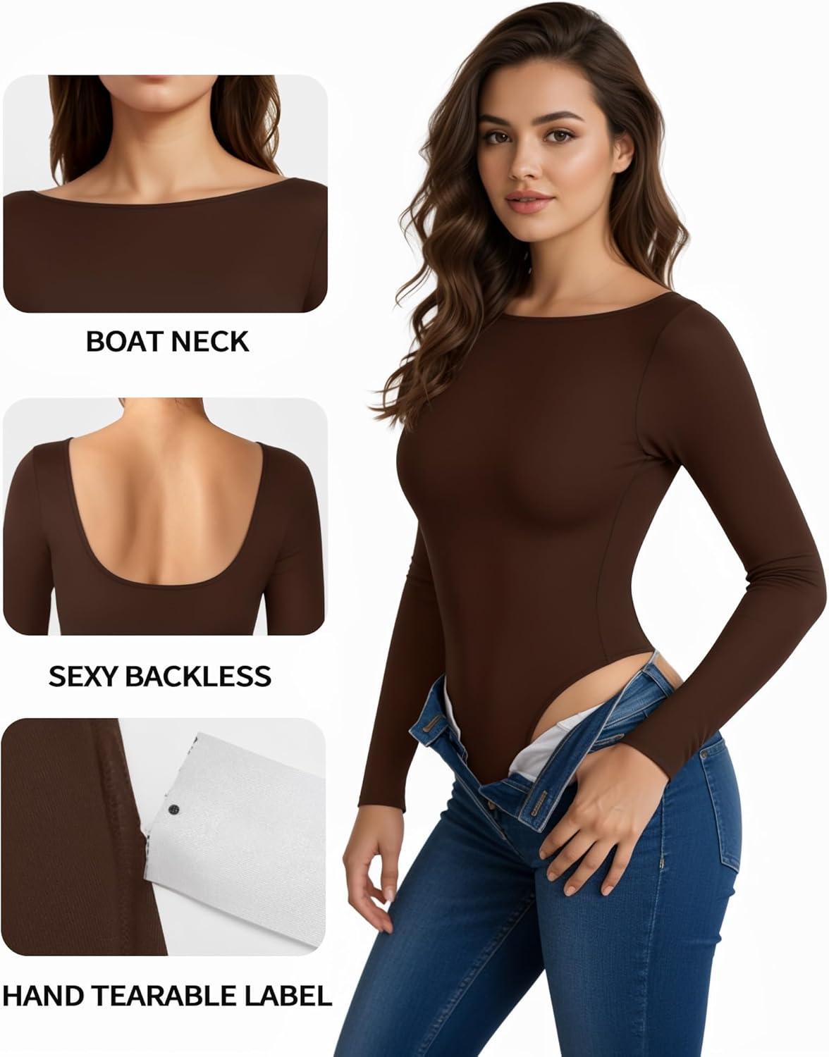 imageMANGOPOP Womens Backless Long Sleeve Bodysuit Boat Neck Y2K Body Suit Open Back Sexy Fall Basic TopCoffee