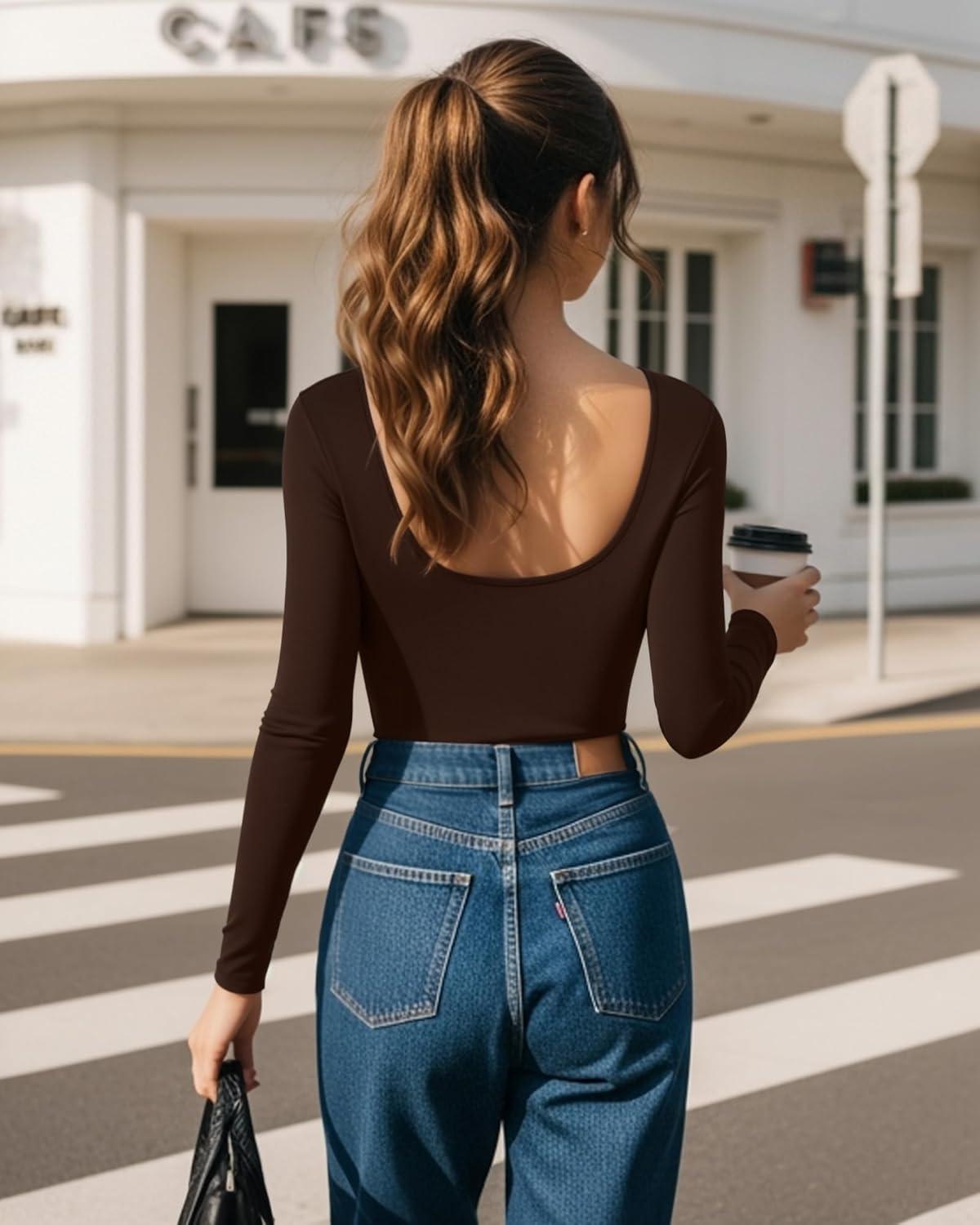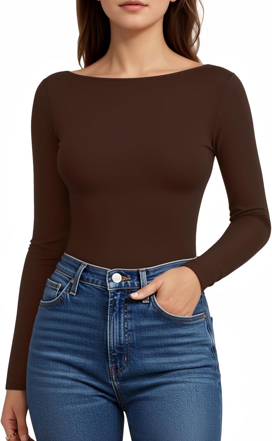 MANGOPOP Women's Backless Long Sleeve Bodysuit Boat Neck Y2K Body Suit Open Back Sexy Fall Basic Top(Coffee)