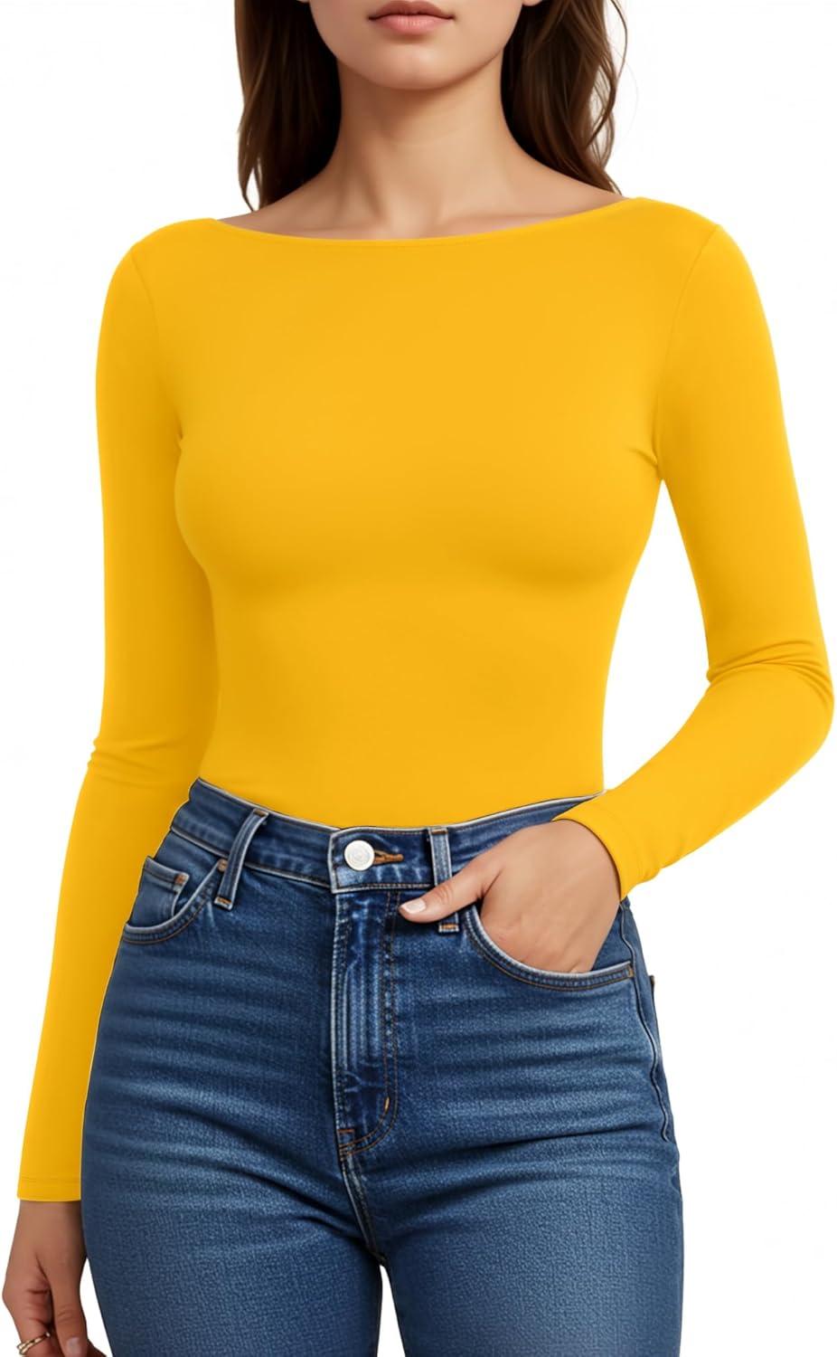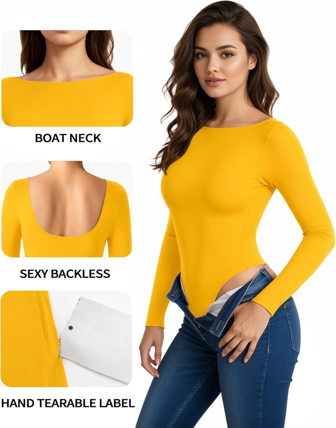 MANGOPOP Women’s Backless Long Sleeve Bodysuit Boat Neck Y2K Body Suit Open Back Sexy Fall Basic Top(Yellow)