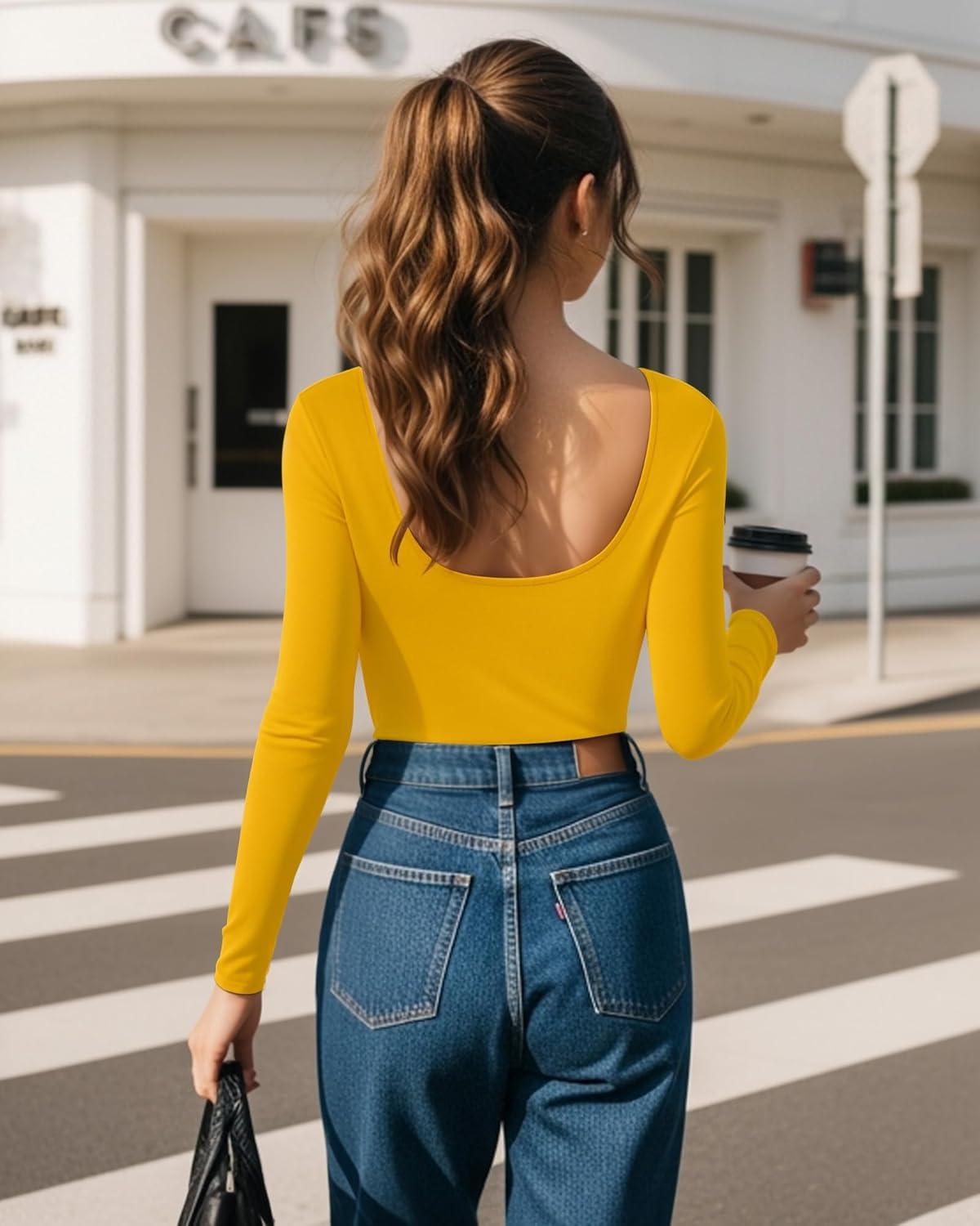 MANGOPOP Women's Backless Long Sleeve Bodysuit Boat Neck Y2K Body Suit Open Back Sexy Fall Basic Top(Yellow)