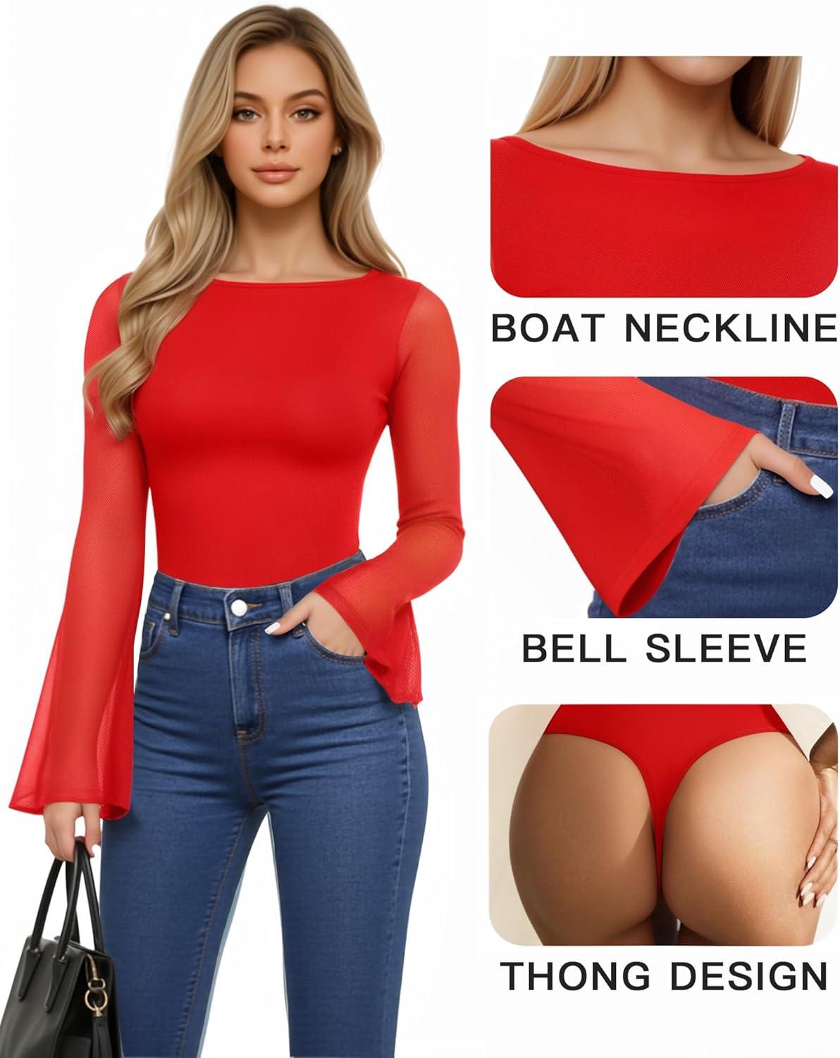 MANGOPOP Women's Boat Neck Bell Sleeve Bodysuit Sexy Sheer Mesh Double Lined Body Suits Going Out Fall Tops 2025(03 Red)
