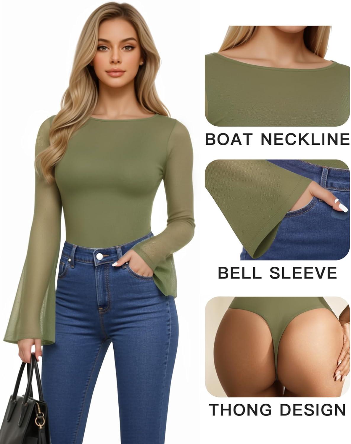 MANGOPOP Women's Boat Neck Bell Sleeve Bodysuit Sexy Sheer Mesh Double Lined Body Suits Going Out Fall Tops 2025(05 Army Green)