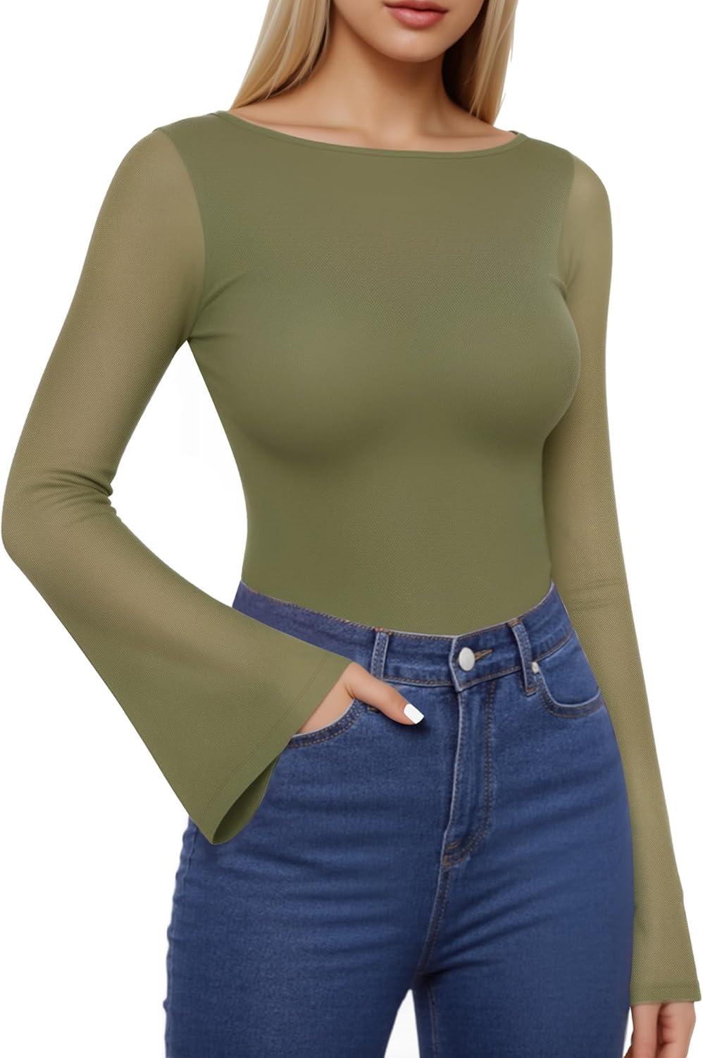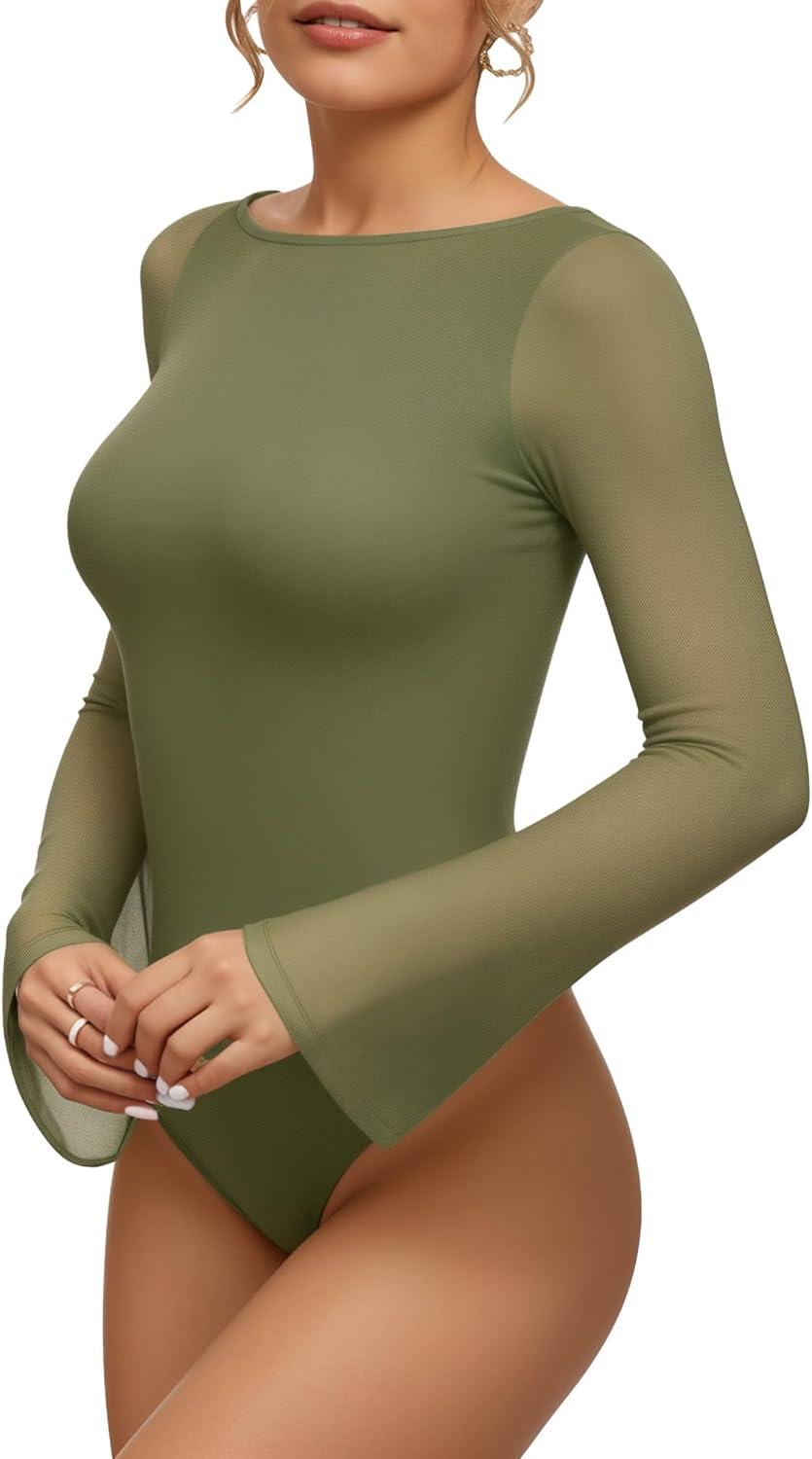 MANGOPOP Women’s Boat Neck Bell Sleeve Bodysuit Sexy Sheer Mesh Double Lined Body Suits Going Out Fall Tops 2025(05 Army Green)