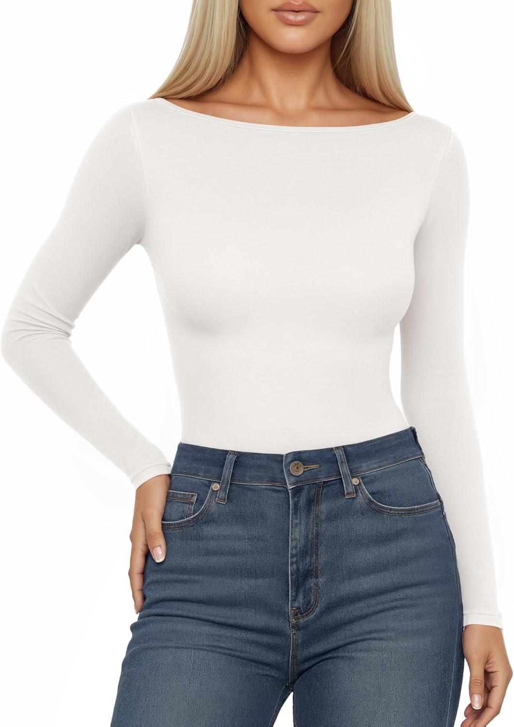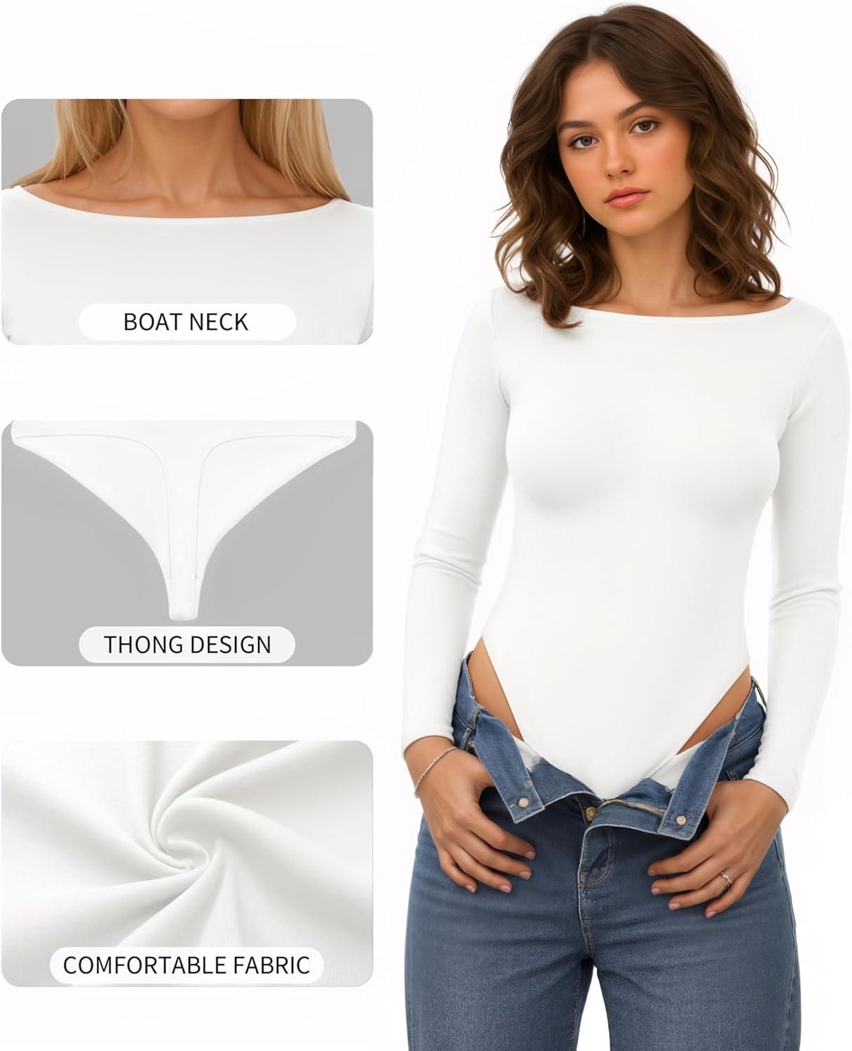MANGOPOP Women's Boat Neck Long Sleeve Bodysuit Basic Thong Body Suit Fall Going Out Tops 2025(02 White)