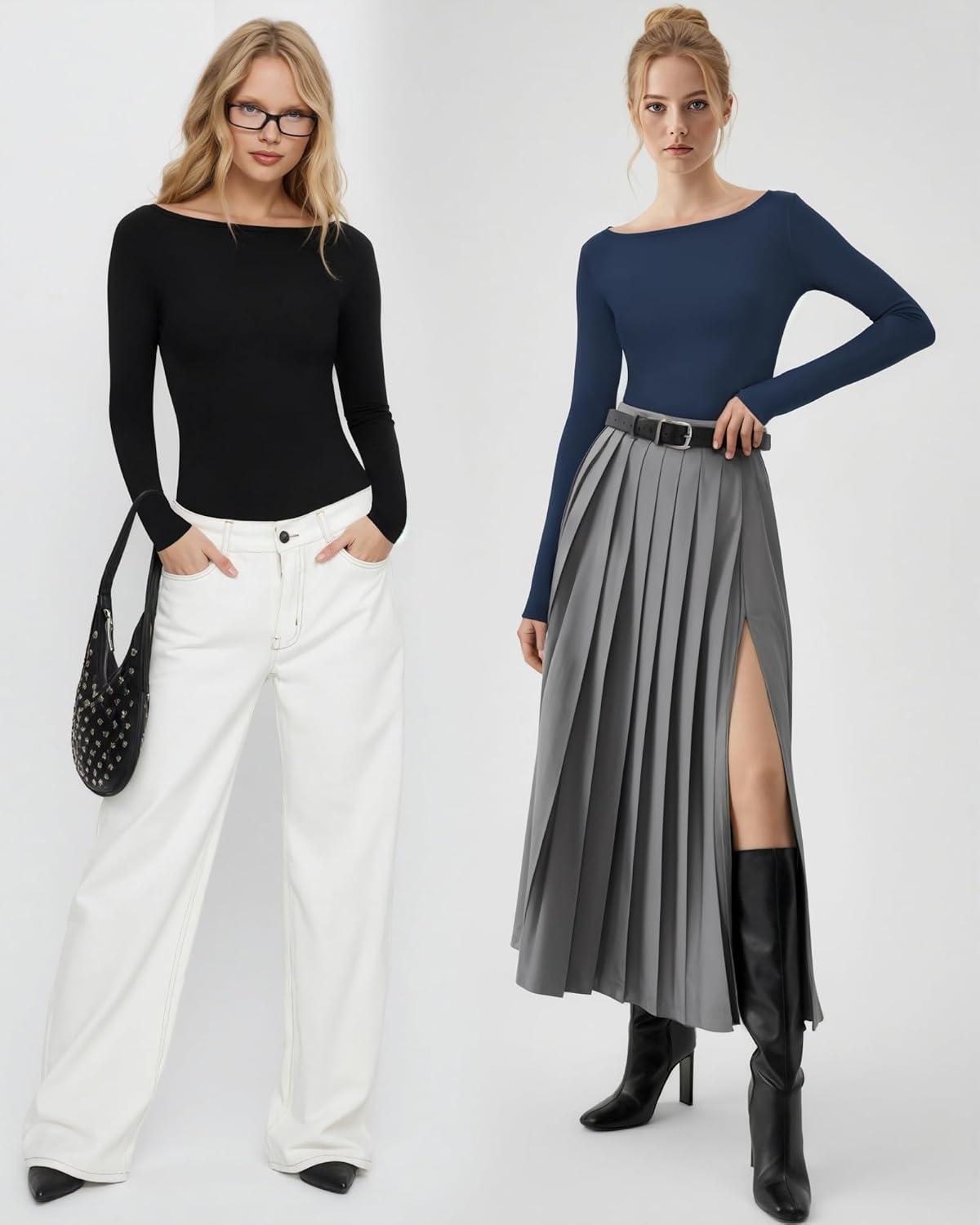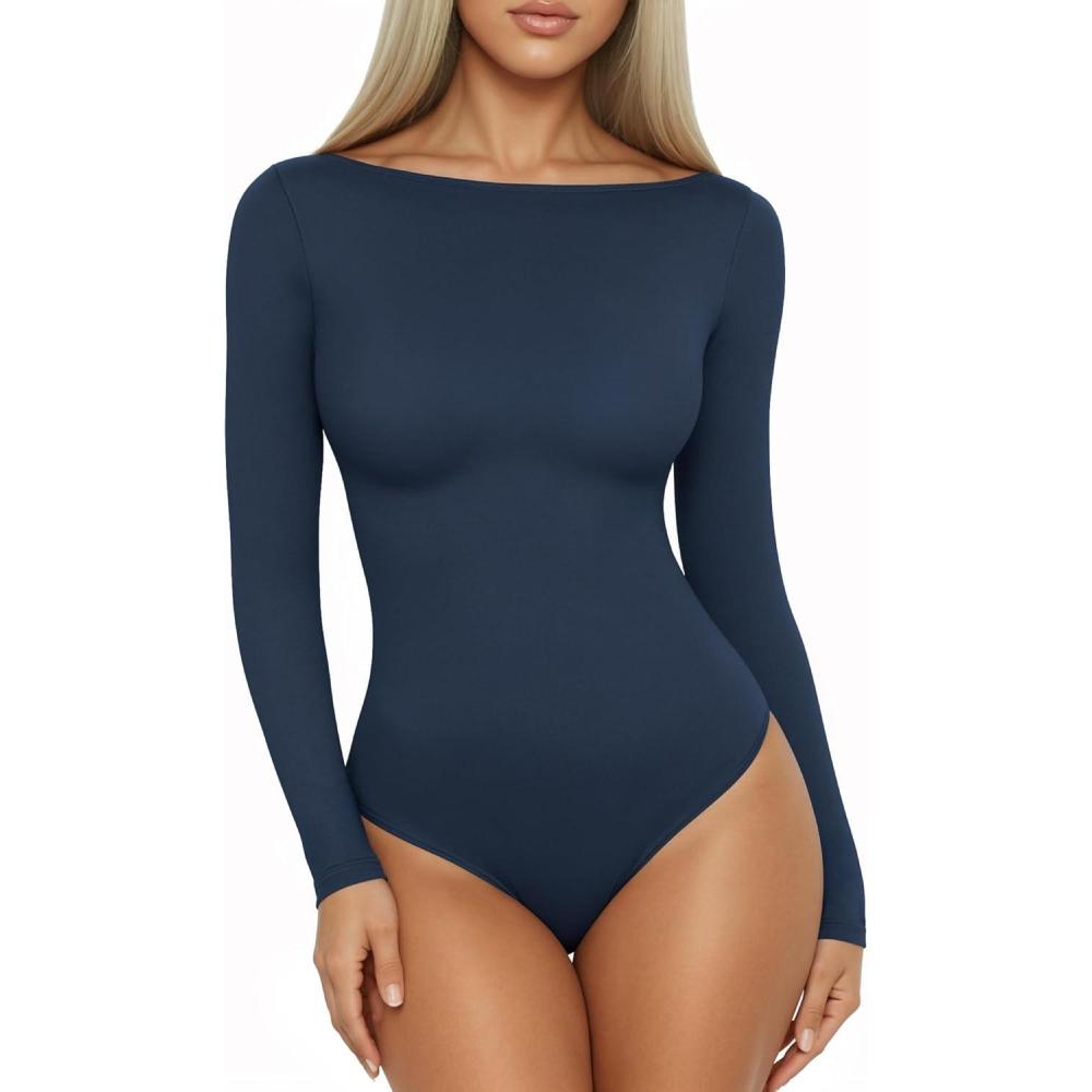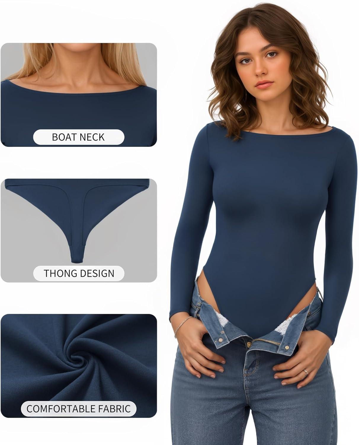 MANGOPOP Women's Boat Neck Long Sleeve Bodysuit Basic Thong Body Suit Fall Going Out Tops 2025(Deep Blue)