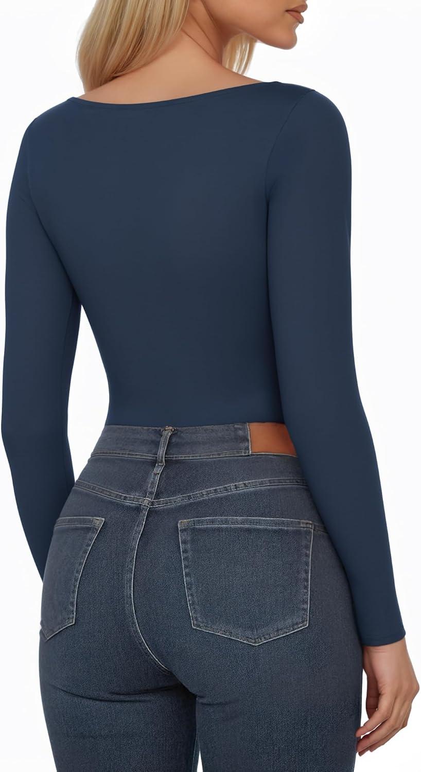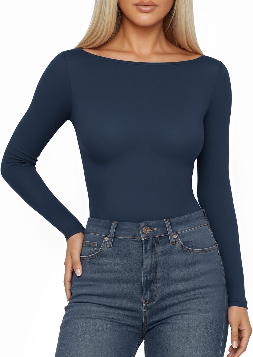 MANGOPOP Women’s Boat Neck Long Sleeve Bodysuit Basic Thong Body Suit Fall Going Out Tops 2025(Deep Blue)