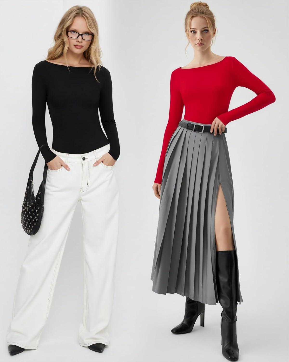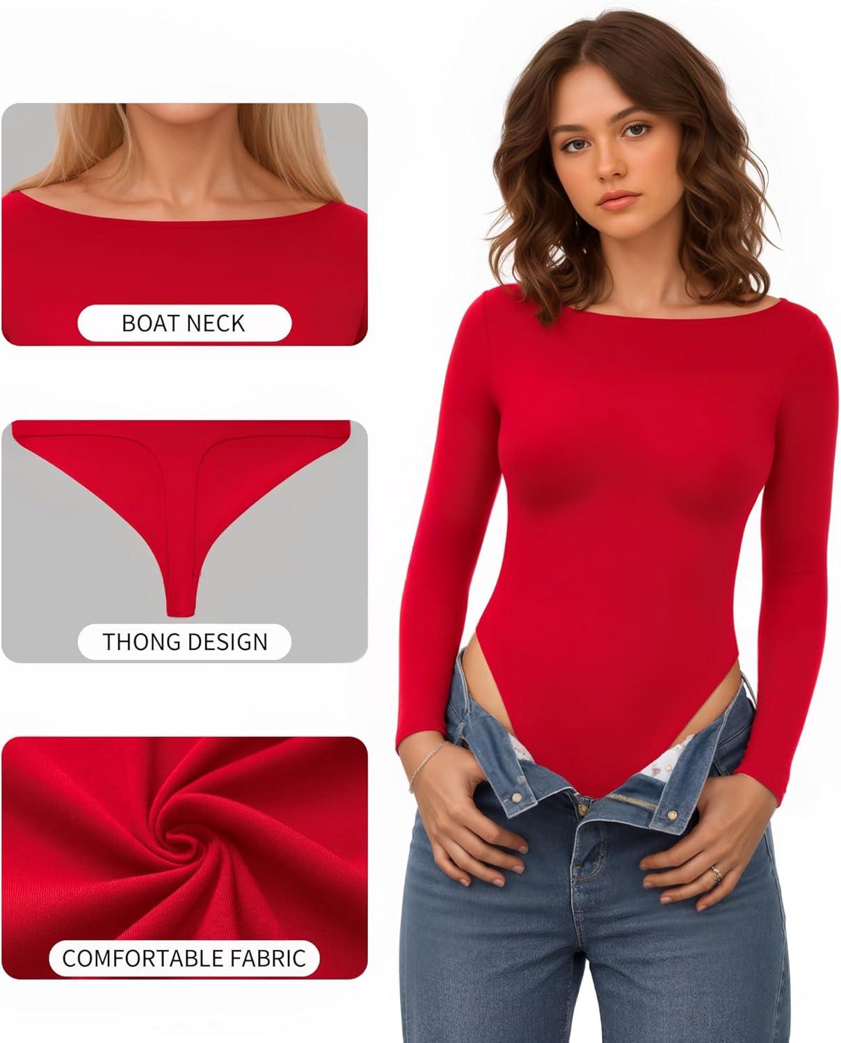 MANGOPOP Women's Boat Neck Long Sleeve Bodysuit Basic Thong Body Suit Fall Going Out Tops 2025(Red)