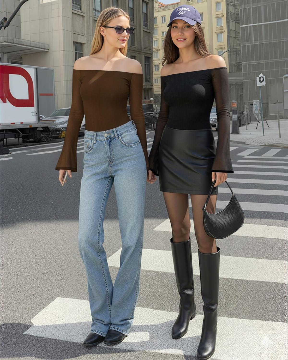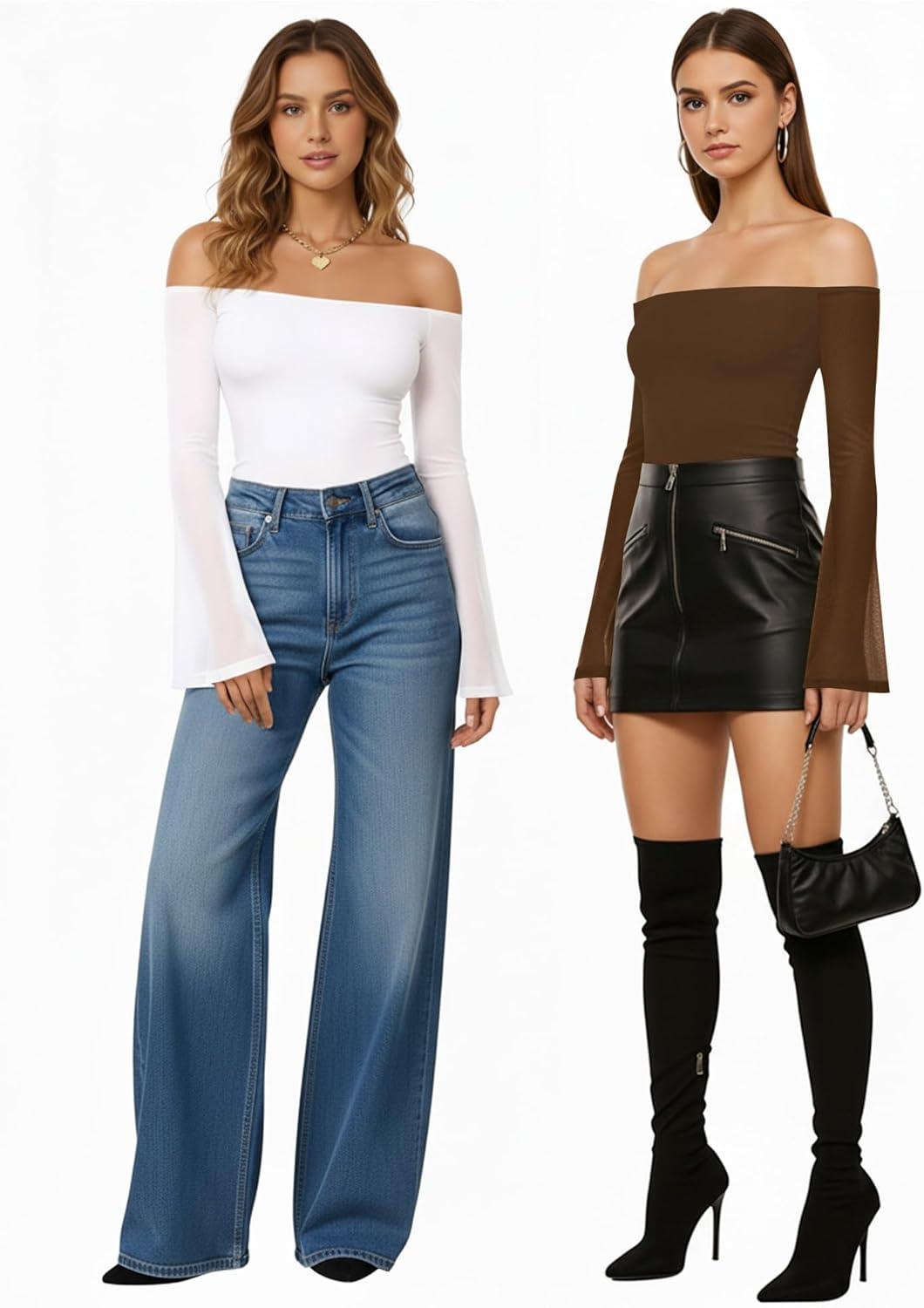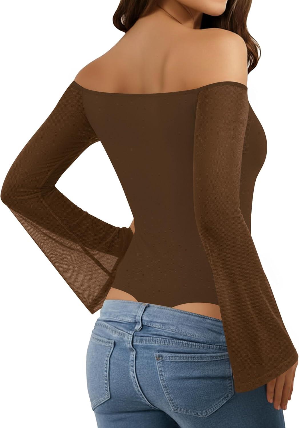 MANGOPOP Women's Off The Shoulder Double Lined Bodysuit Mesh Bell Sleeve Body Suits Sexy Going Out Fall Backless Tops 2025(04 Brown)