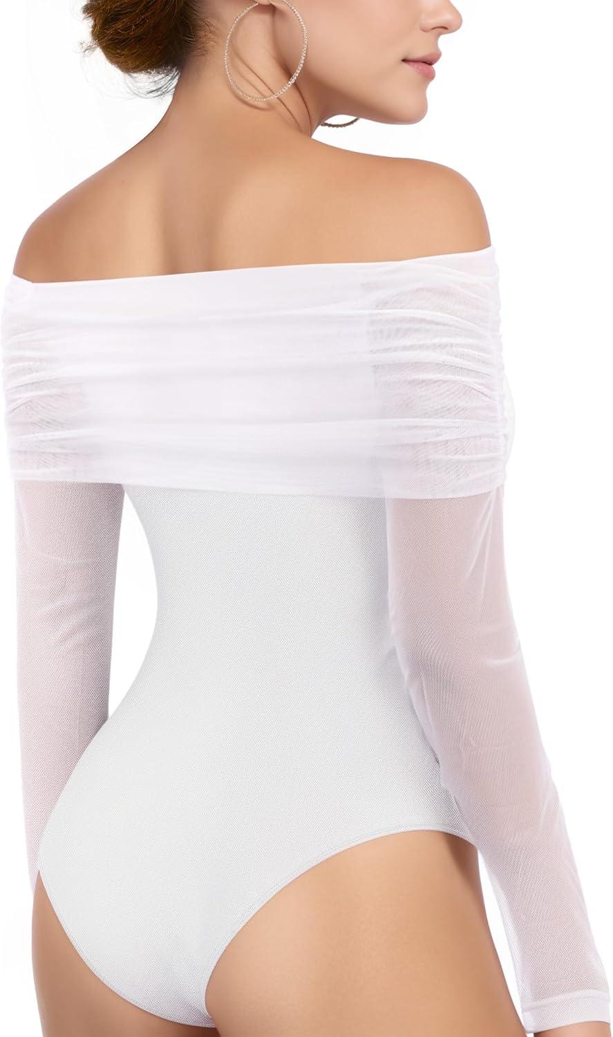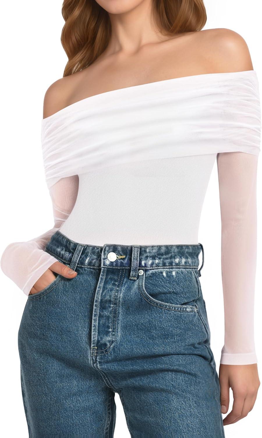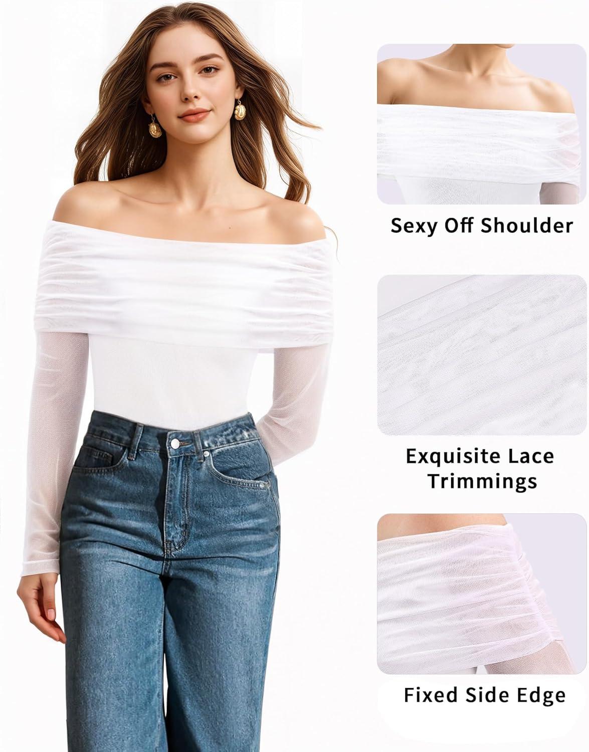 MANGOPOP Women's Off The Shoulder Long Sleeve Bodysuit Sexy Sheer Mesh Top Double Lined Body Suits Fall Outfit 2025(01 White)