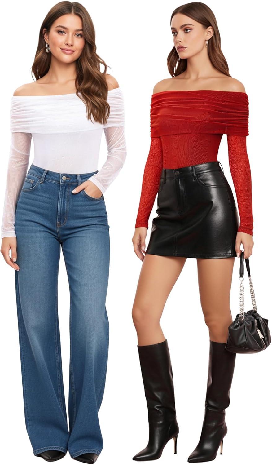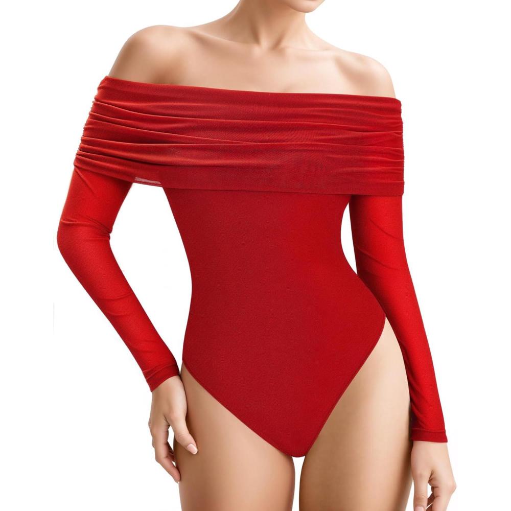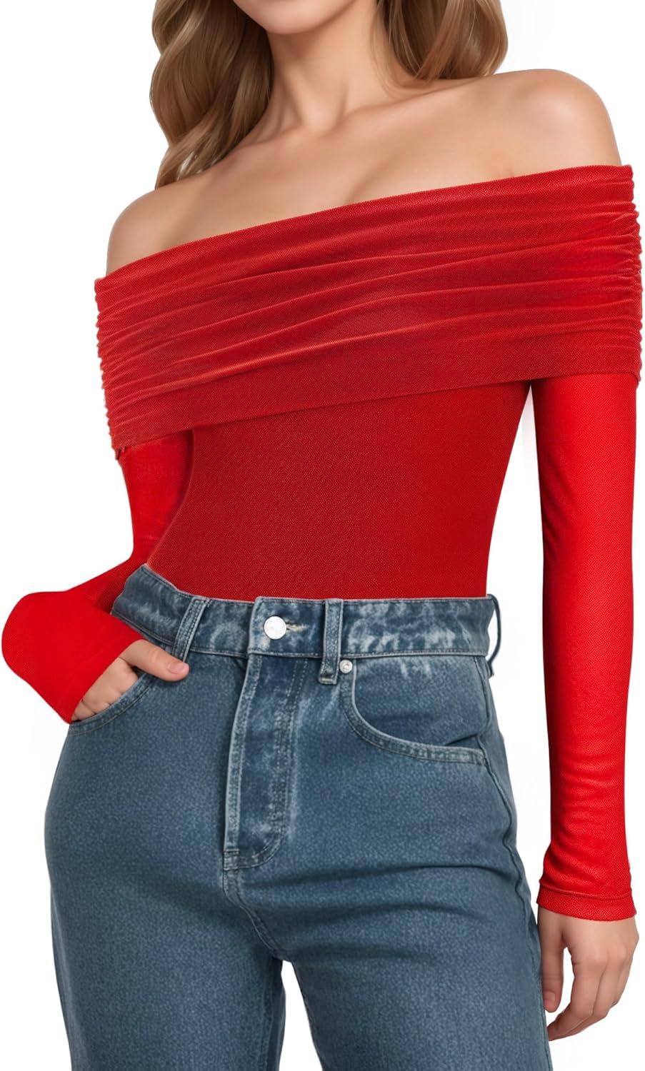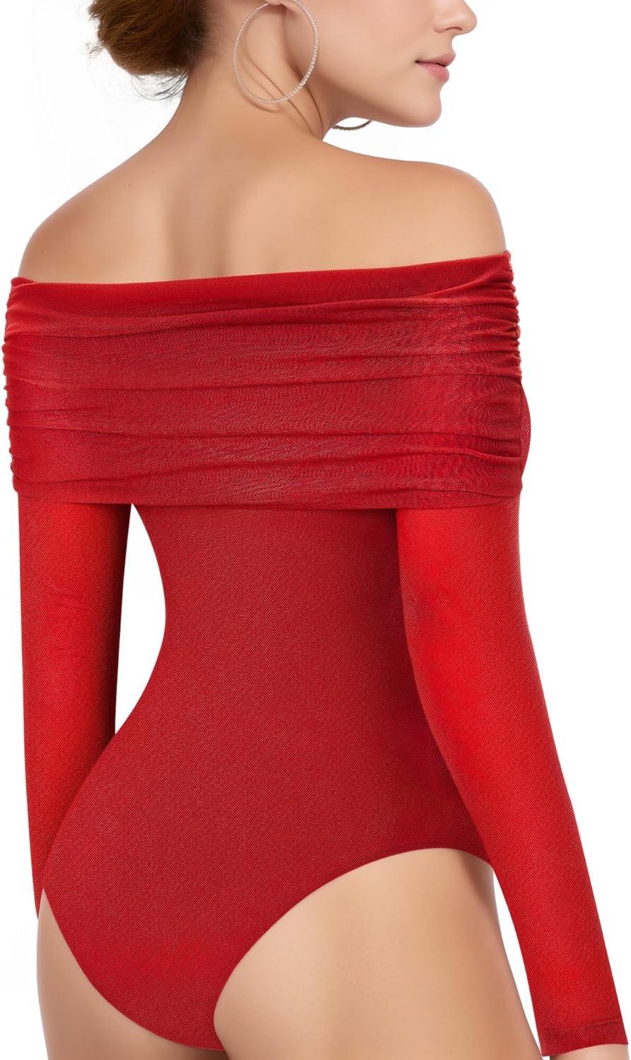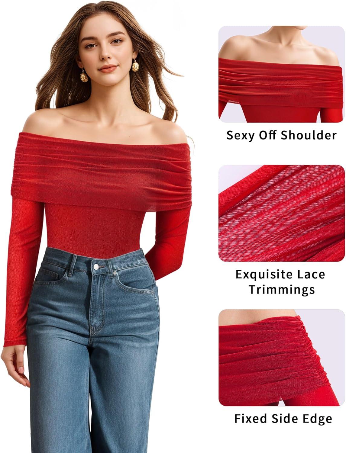 MANGOPOP Women's Off The Shoulder Long Sleeve Bodysuit Sexy Sheer Mesh Top Double Lined Body Suits Fall Outfit 2025(Red)