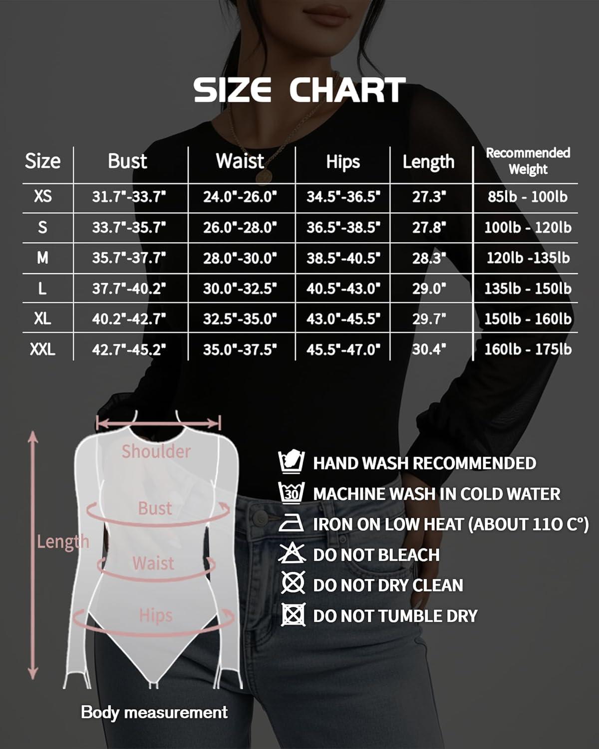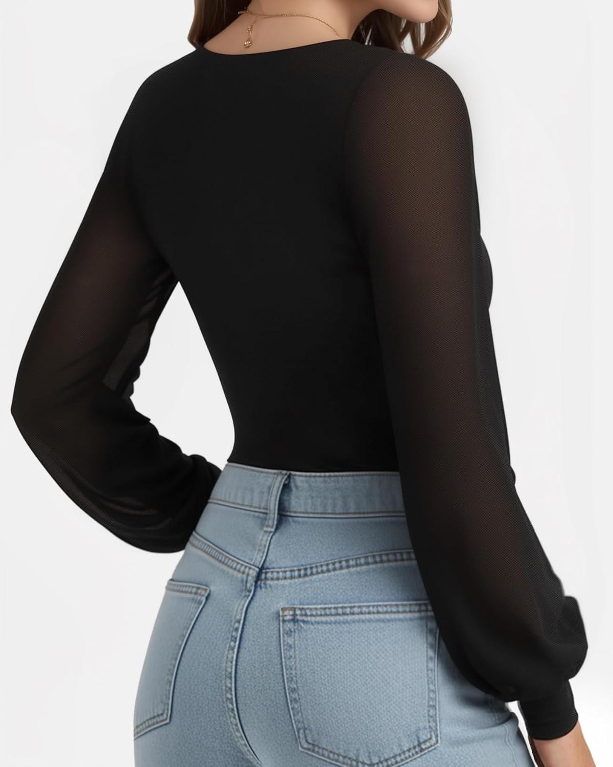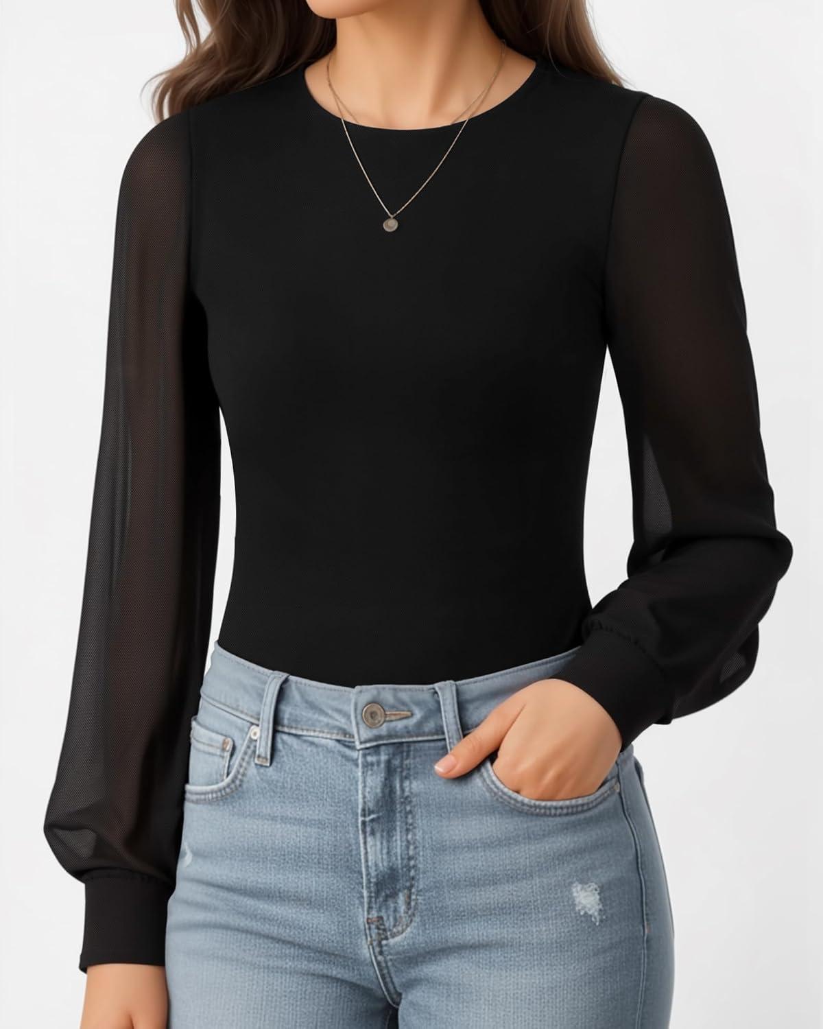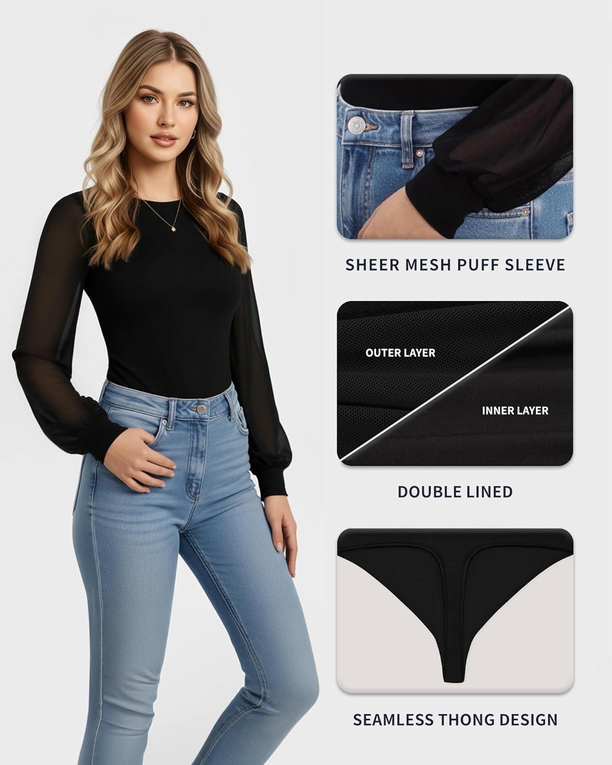 MANGOPOP Women’s Sheer Mesh Puff Long Sleeve Bodysuit Double Lined Crew Neck Thong Body Suits Trendy Fall Tops 2025(01 Black)