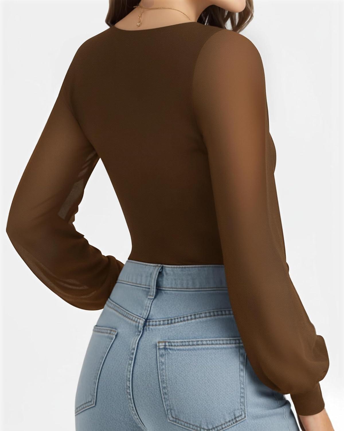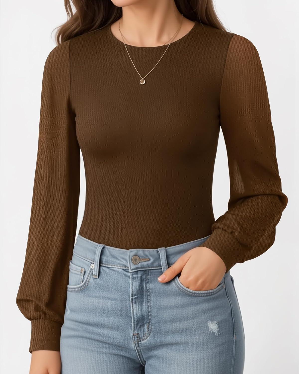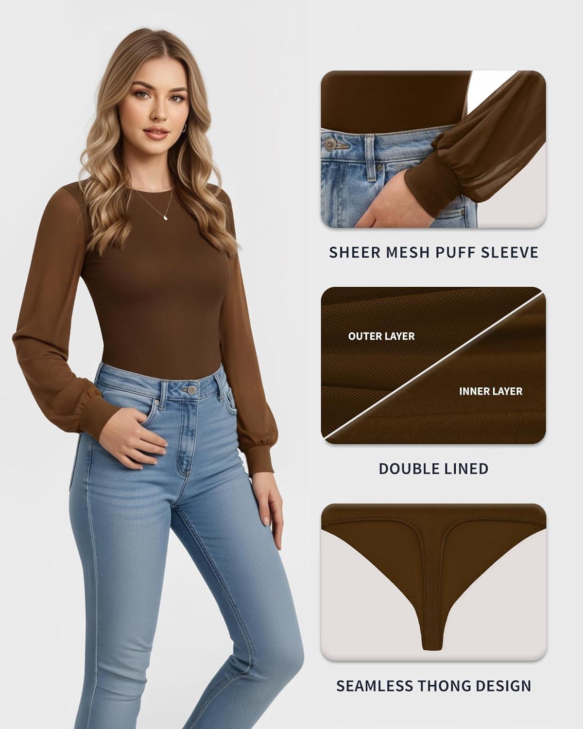 MANGOPOP Women’s Sheer Mesh Puff Long Sleeve Bodysuit Double Lined Crew Neck Thong Body Suits Trendy Fall Tops 2025(Coffee)
