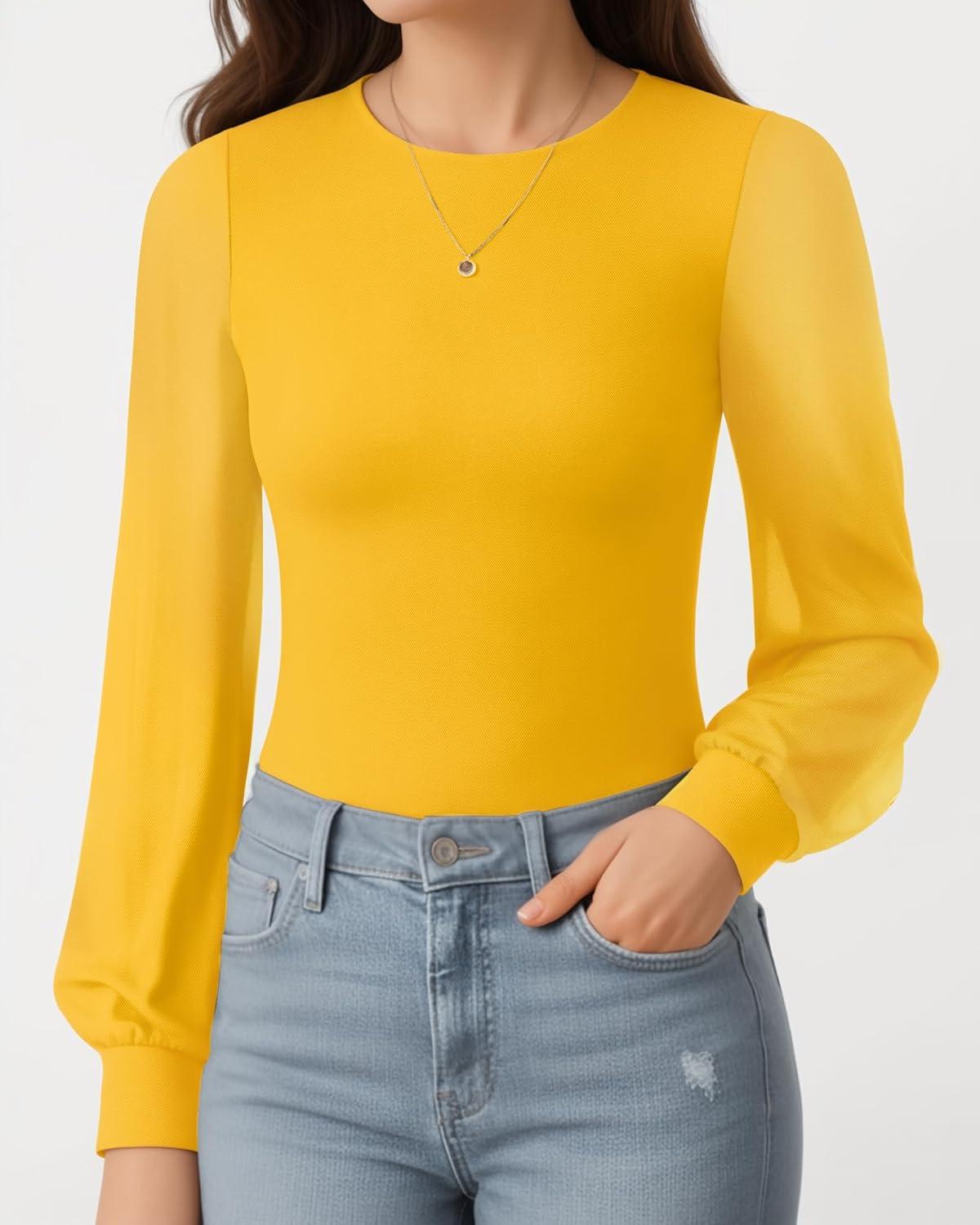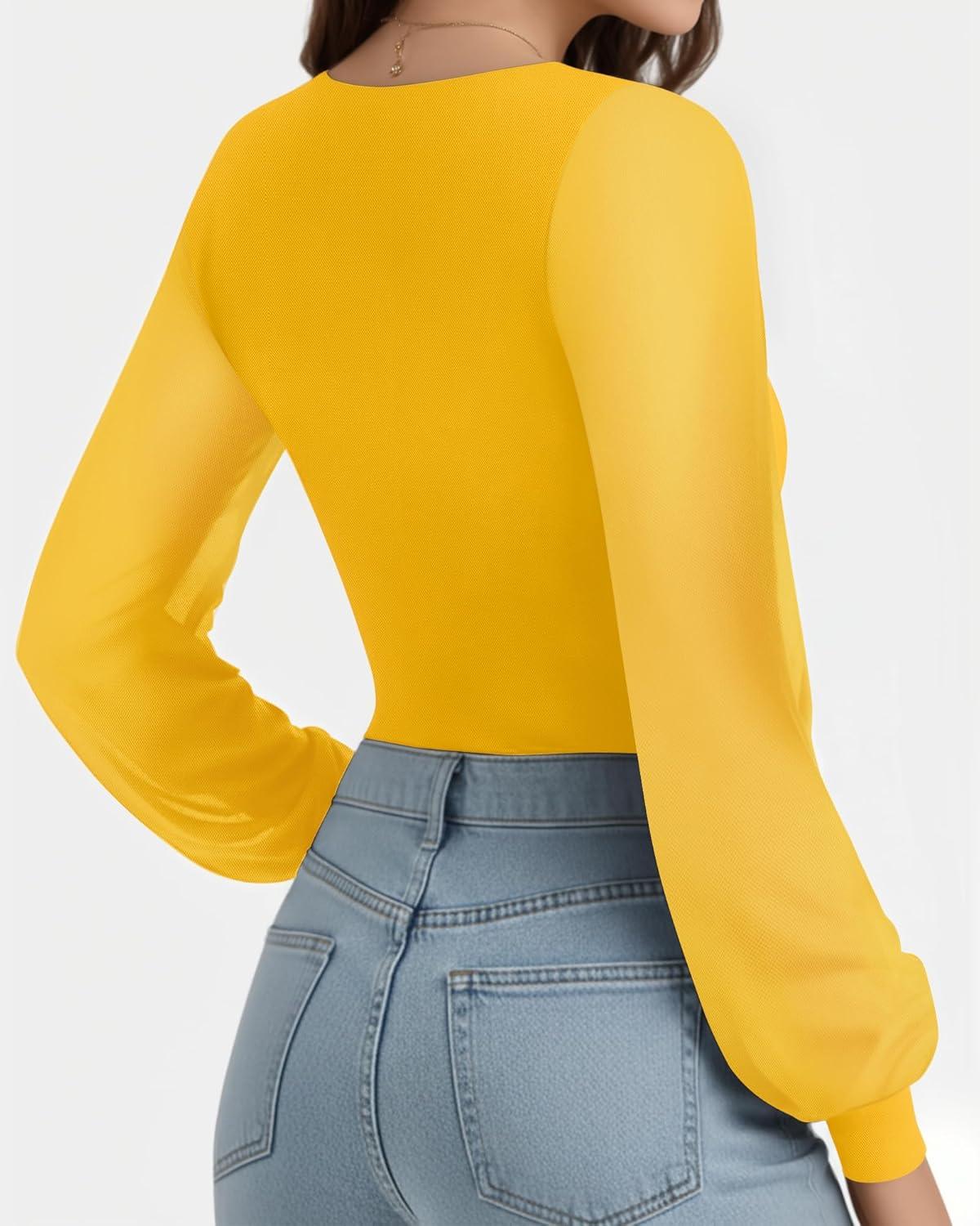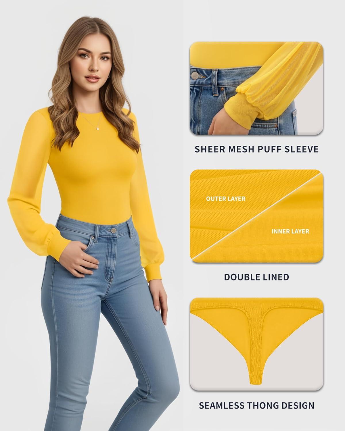 MANGOPOP Women’s Sheer Mesh Puff Long Sleeve Bodysuit Double Lined Crew Neck Thong Body Suits Trendy Fall Tops 2025(Yellow)