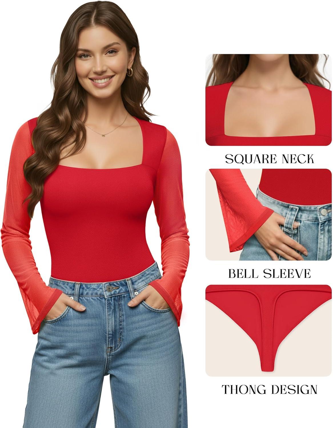 MANGOPOP Women’s Square Neck Bell Sleeve Bodysuit Mesh Double Lined Body Suits Trend Going Out Tops Fall Outfits 2025(Red)
