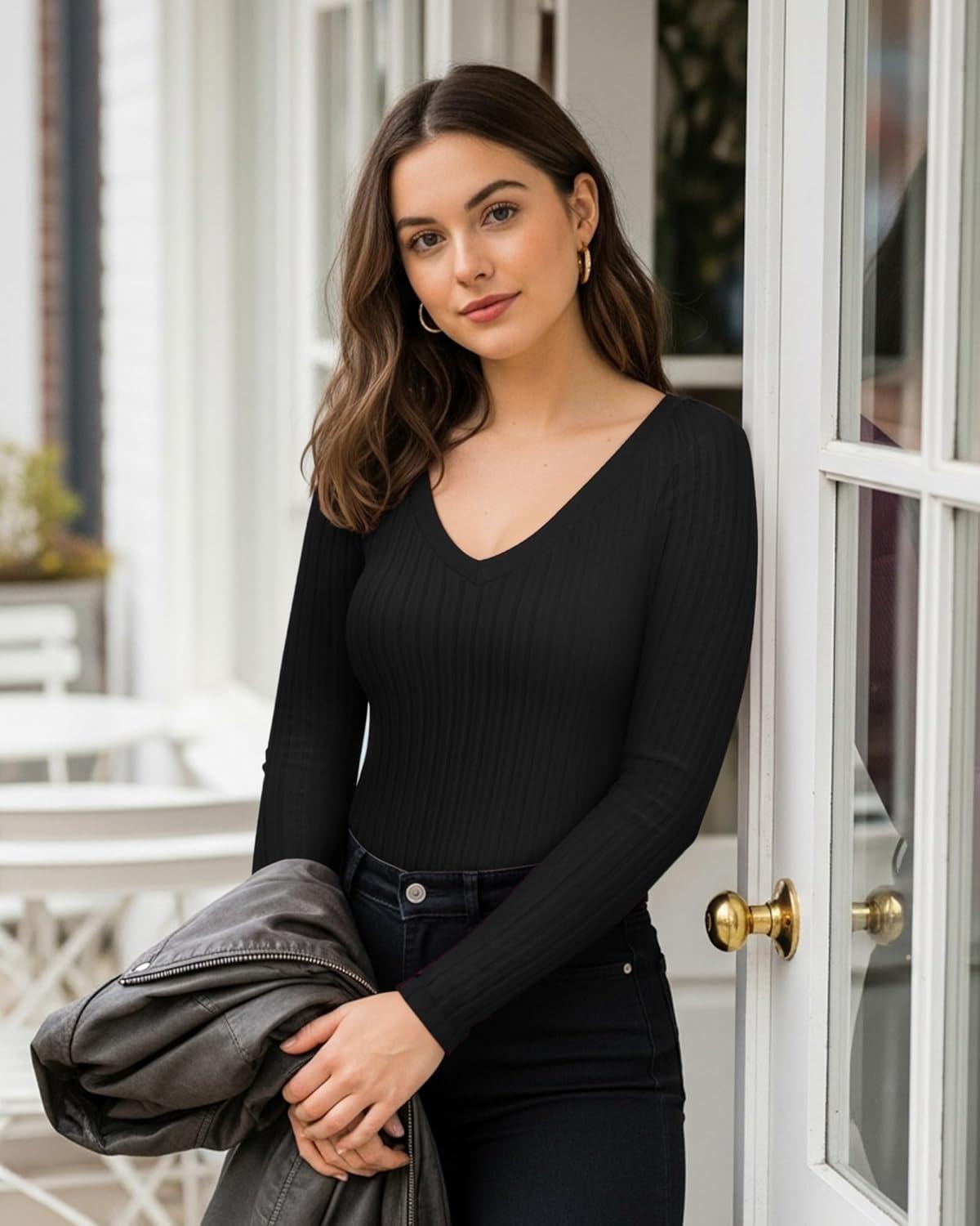 MANGOPOP Women's V Neck Long Sleeve Bodysuit Sweater Slim Fitted Body Suit Thermal Fleece Ribbed Knit Fall Tops 2025(01 Black)