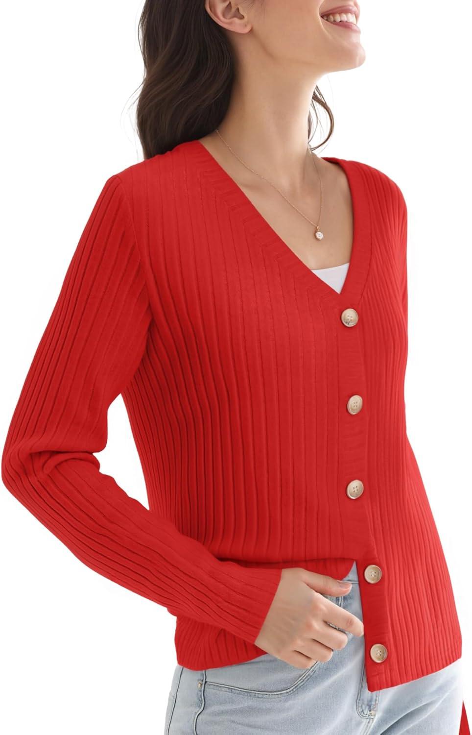 Women’s Lightweight Cardigan Fall Cozy Cardigan Sweaters V Neck Ribbed Button Up 2025 Trendy(Red)